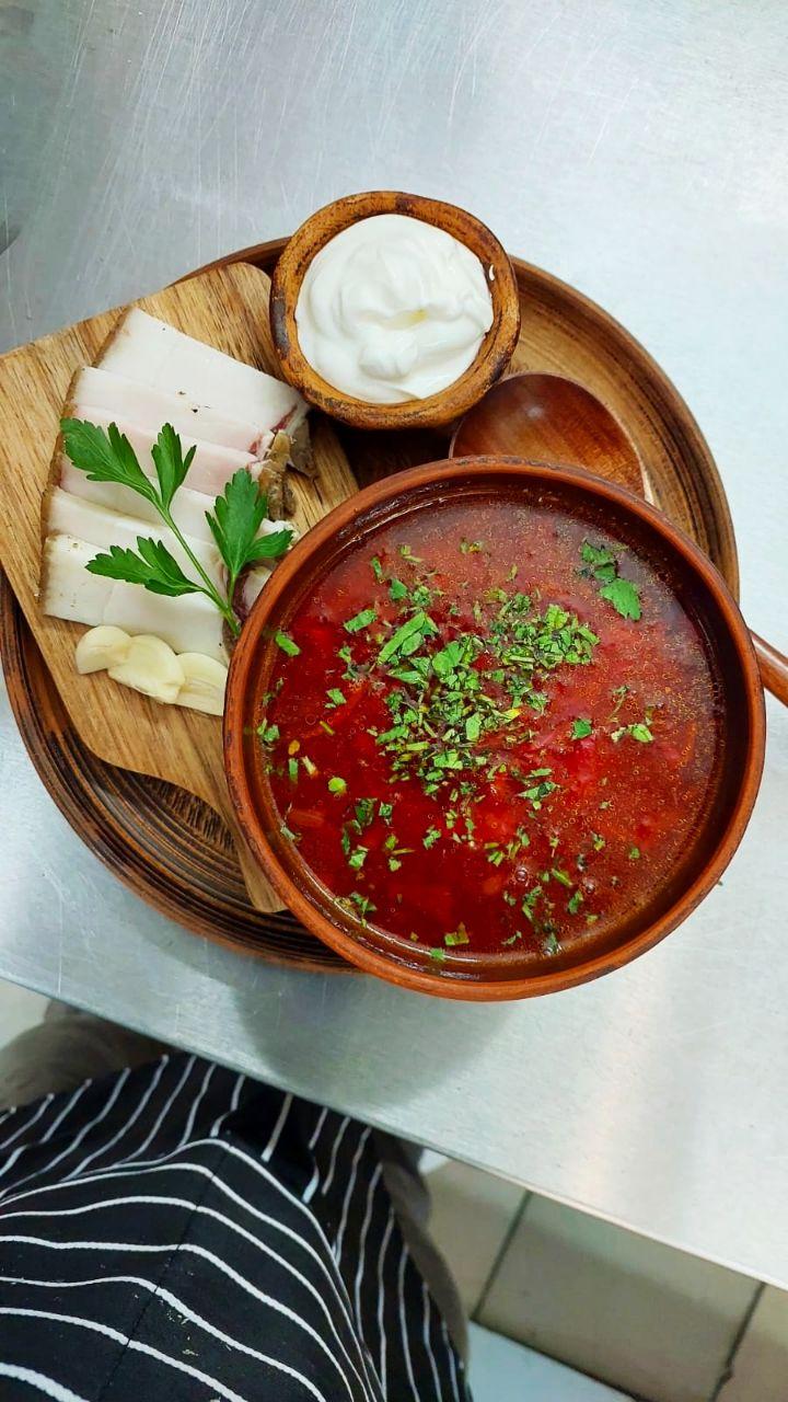 Состав: куриный бульон, свекла, томаты, морковь, лук репчатый, капуста, мясо курицы, соль, перец, зелень, сметана