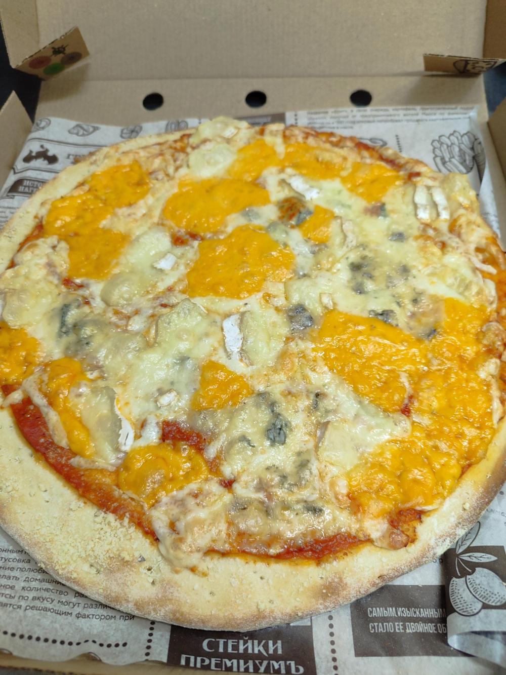 Состав: моцарелла, пармезан, дор блю, чеддер, фирменный соус