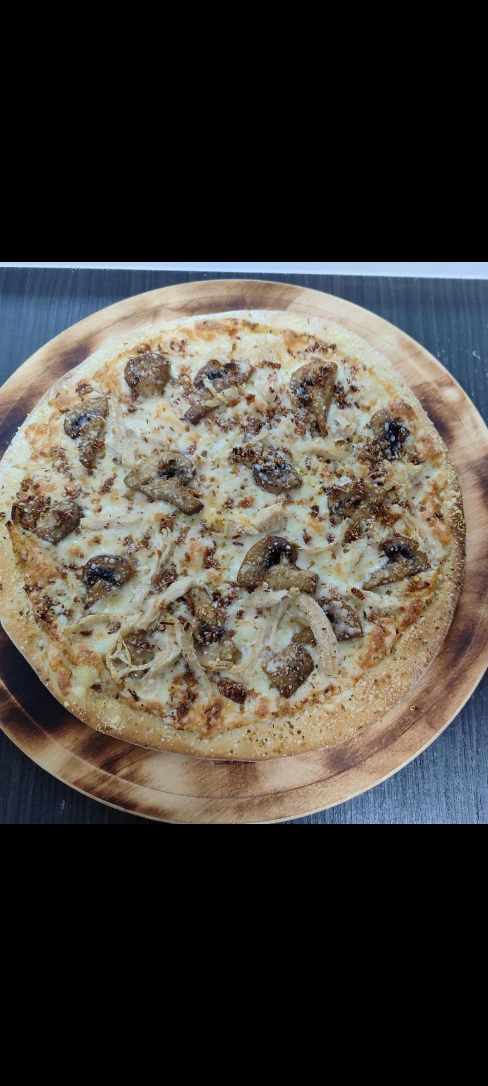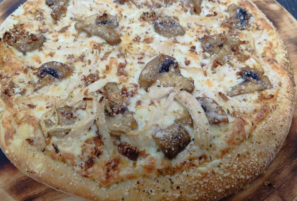 Курица, грибы, моцарелла, фирменный соус, пармезан.